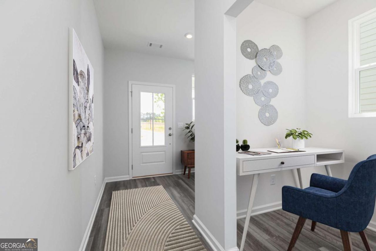 Stanley Martin Homes presents The Tyndall, a thoughtfully designed two-story home that blends functionality and style. Just off the foyer, a convenient pocket office provides a quiet spot for work or study. The open-concept main level connects the kitchen, family room, and dining area, creating a bright and inviting space for gatherings. The kitchen features a large island, abundant cabinet storage, and a spacious pantry, while the family room centers around a cozy electric fireplace. The dining area extends to a rear patio-perfect for outdoor entertaining or relaxing after a long day. Upstairs, the primary suite is a true retreat with a spa-inspired bath featuring a soaking tub, dual vanities, a seated shower, and a massive walk-in closet. Three additional bedrooms, each with their own walk-in closet, and a centrally located laundry room complete this versatile design. You'll love the thoughtful layout and attention to detail that make this home ideal for modern living-schedule your visit today and experience the Tyndall for yourself! Located in the desirable Annsbury Park community in Lilburn, enjoy proximity to great schools, parks, shopping, and dining. Community amenities include green space and a future pocket park for neighbors to enjoy.