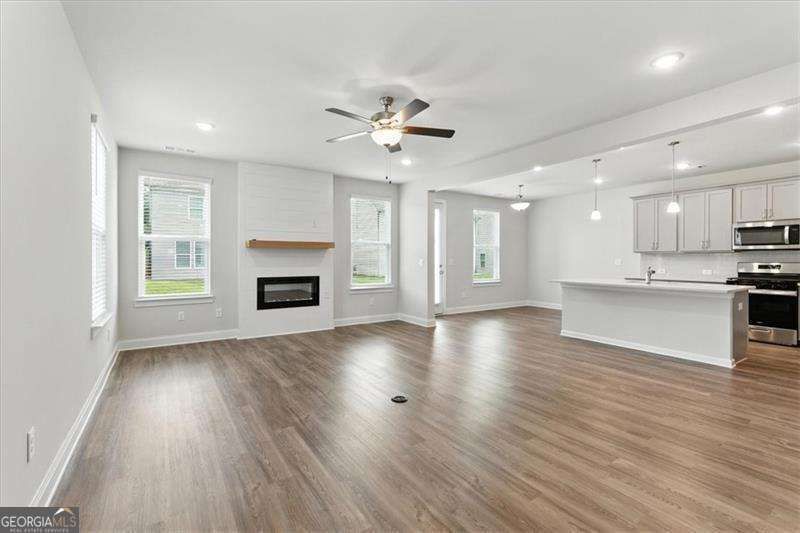 Welcome to this stunning 4 bedroom, 3.5 bathroom home in the heart of Kennesaw! Designed with both style and function in mind, this home showcases the signature finishes including stainless steel appliances, quartz countertops, 42 inch cabinets, and a gas log fireplace with shiplap to the ceiling with a natural cedar mantel. The main level features hardwood floors and an open staircase with black iron railing for a modern touch. Upstairs, the primary suite is a true retreat with a tray ceiling, spa-like bath with a frameless glass shower, and a laundry room conveniently stubbed for a sink. Two bedrooms include their own private en-suites, while the remaining two share a Jack & Jill bath, creating the perfect balance of privacy and convenience. Located at the end of a quiet cul-de-sac in a gated community, this home offers extra privacy, natural light, and peace of mind. With no rental restrictions, it's a fantastic choice for families looking to be close to KSU, shopping, dining, and major highways or for investors wanting to grow their portfolio. Move-in ready, this one truly checks every box!